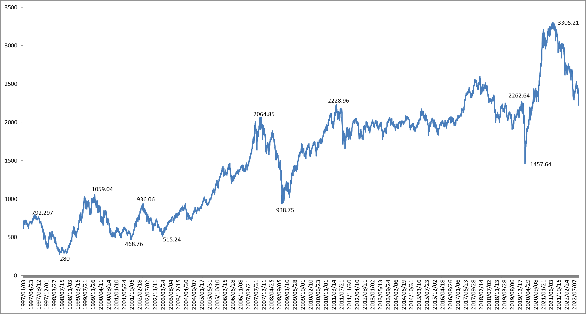 2000년 1월 4일 1059.04로 IMF로 인한 지수 폭락 이전보다 훨씬 상승하였으나, 닷컴 버블로 인해 하락하기 시작했습니다.