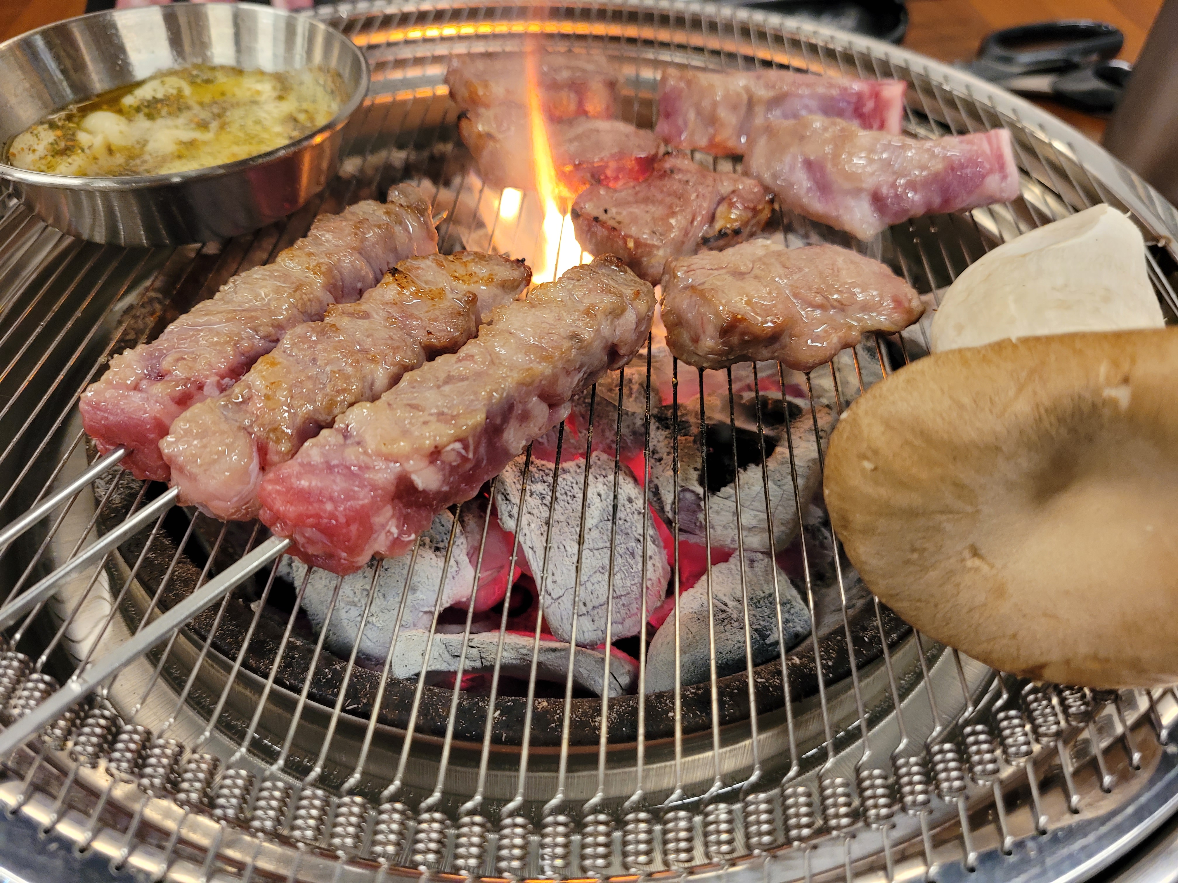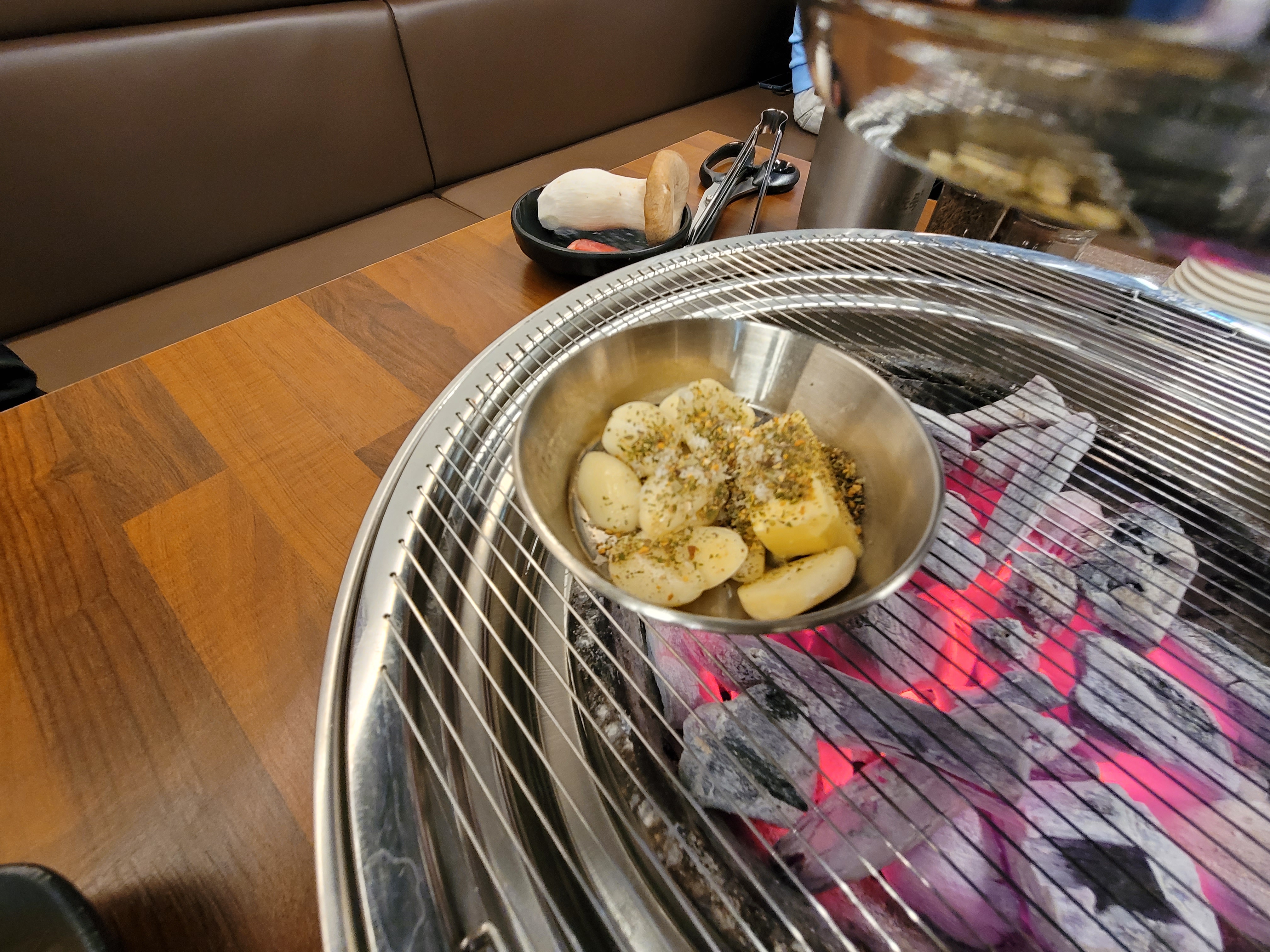 화롯불 위에 올려진 접시는 버터마늘인데, 마늘의 민족 한국인에게 아주 좋은 곁들임이었다.