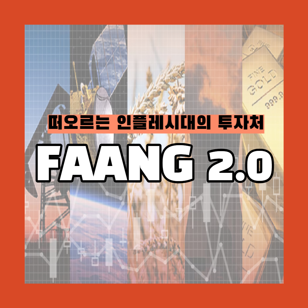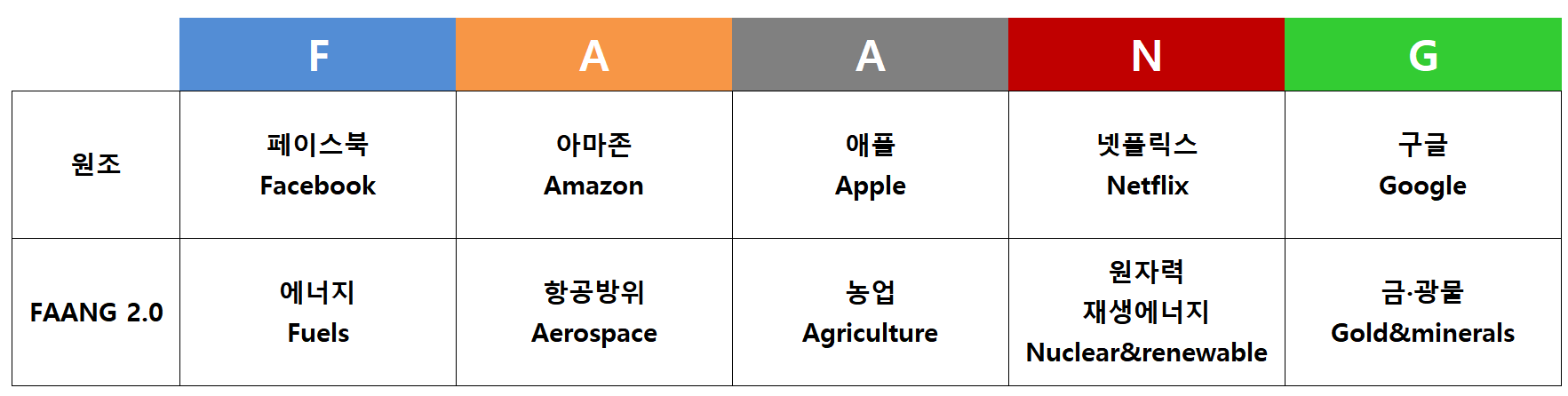 FAANG 2.0이란 에너지(Fuels), 항공방위(Aerospace), 농업(Agriculture), 원자력과 재생에너지(Nuclear&renewable), 금과 광물(Gold&metal&minierals)로 인플레시대에 새롭게 떠오르는 업종 5개를 뜻합니다.