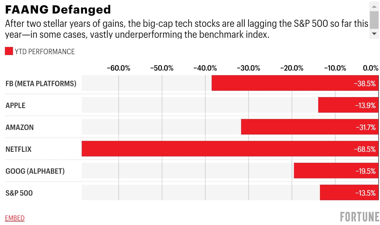 수년간 뉴욕 증시의 붐을 주도했던 FAANG(페이스북, 아마존, 애플, 넷플릭스, 구글)의 주가도 빠지고 있습니다. 아래는 포춘지에 나온 FAANG 기업들의 YTD 그래프입니다.