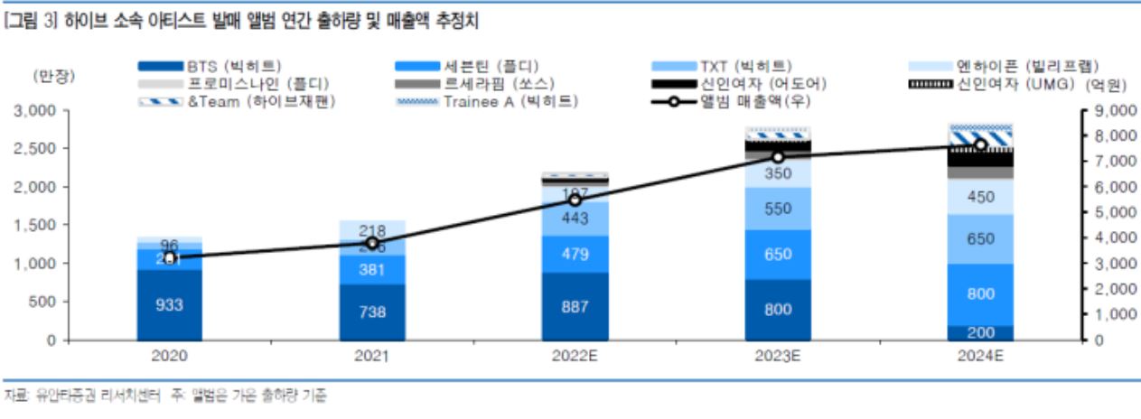 BTS 외 세븐틴, TXT, 엔하이픈, 르세라핌, 뉴진스 등 다른 아티스트들과 하이브가 밀고 있는 팬덤 플랫폼 위버스의 향후 성장성이 아직 반영되어 있지 않은 상황입니다.