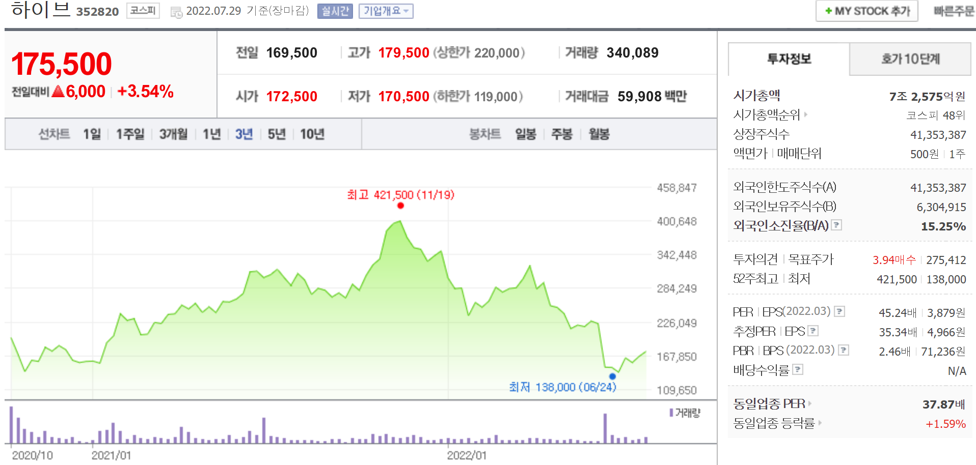 2021년 7월 13일 코스피에 상장한 하이브는 BTS의 글로벌 성공에 힘입어 한때 주가가 장중 421,500원을 찍기도 했으나, 작년 말부터 하락하기 시작했습니다. 지난 6월 15일에는 하이브의 주요 아티스트인 BTS가 유튜브를 통해 그룹 활동은 잠시 쉬고 개인 활동에 나선다고 발표한 후 급락하여 6월 23일 138,000원의 최저가를 찍었습니다.